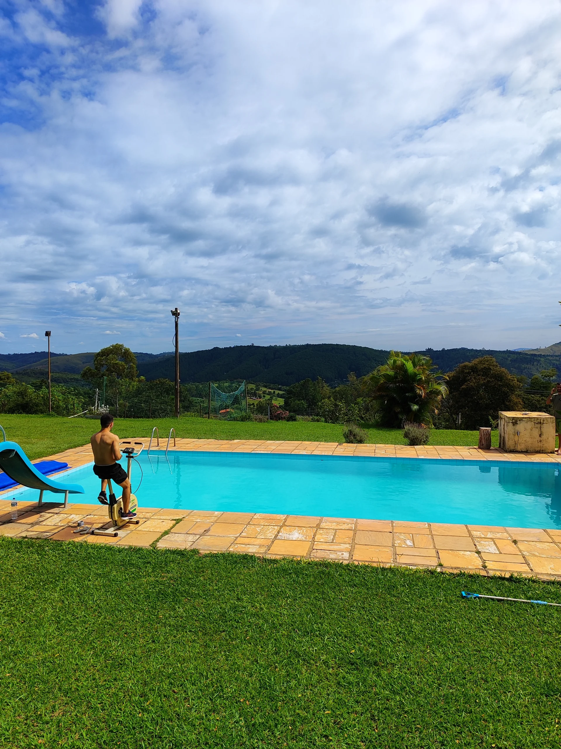 Água sempre agradável, Escorregador, Higienização constante, Vista privilegiada para as montanhas, aquecida por meio solar.